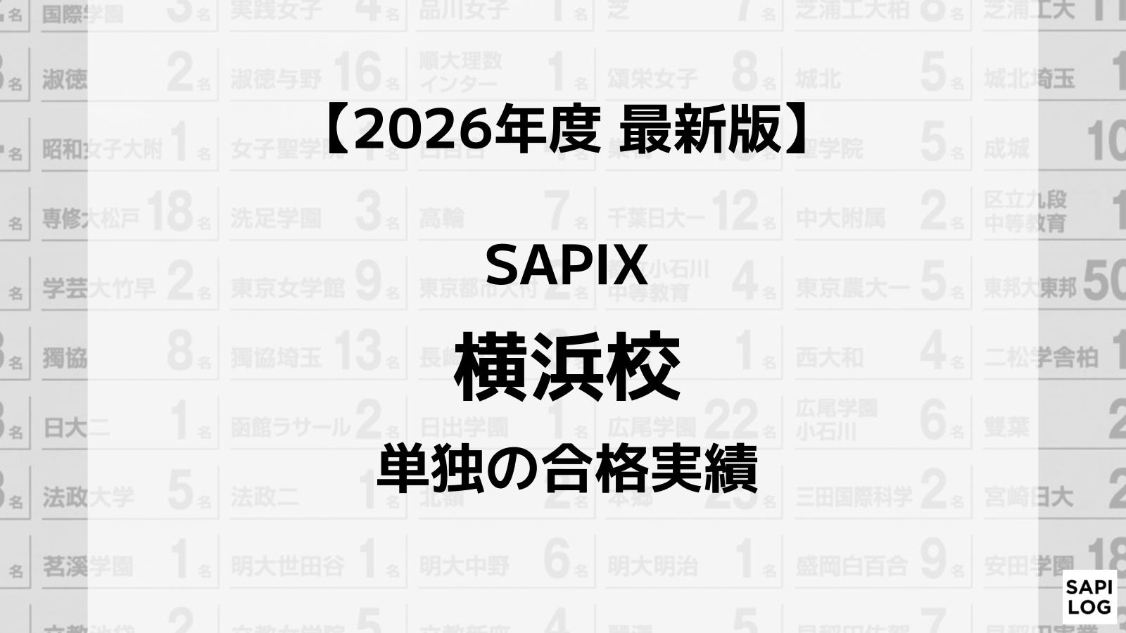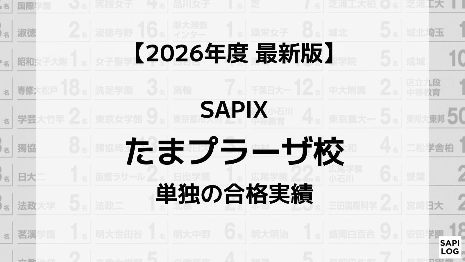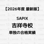 2026.03.27 校舎別実績 【2026年】SAPIX吉祥寺校単独の合格実績まとめ コージ 記事に商品PRを含む場合があります。 SAPIXの公式HPで公開している合格実績は全校舎の合計のみ。そこで本記事では、SAPIX吉祥寺校の1校舎だけの合格実績をご紹介します。 SAPIXの校舎選びにお役立てください! コージ 中学校名をクリックすると他校舎の実績と比較できます。 男/女/共学校名合格数 共青山学院中等部1 男浅野中学校1 男麻布中学校5 男足立学園中学校1 女跡見学園中学校1 共市川中学校9 女浦和明の星女子中学校21 共浦和実業学園中学校1 女桜蔭中学校10 女鴎友学園女子中学校7 女大妻中学校9 女大妻中野中学校11 共大宮開成中学校3 共お茶の水女子大学附属中学校1 男海城中学校17 男開成中学校12 共開智中学校26 共開智所沢中等教育学校118 共開智日本橋学園中学校1 共開智望中等教育学校7 共開智未来中学校1 男学習院中等科1 女学習院女子中等科2 共吉祥寺学園中等部2 女吉祥女子中学校25 男暁星中学校4 女共立女子中学校4 共慶應義塾湘南藤沢中等部1 共慶應義塾中等部7 男慶應義塾普通部1 女恵泉女学園中学校14 女晃華学園中学校10 女光塩女子学院中等科5 男佼成学園中学校5 女国府台女子学院中学部3 女香蘭女学校中等科1 共國學院大學久我山中学校53 男駒場東邦中学校8 共埼玉栄中学校3 共栄東中学校72 共佐久長聖中学校30 共狭山ヶ丘高等学校付属中学校1 女実践女子学園中学校1 男芝中学校7 共芝浦工業大学柏中学校2 共芝浦工業大学附属中学校1 共渋谷教育学園渋谷中学校20 共渋谷教育学園幕張中学校10 女淑徳与野中学校19 共順天堂大学系属理数インター中学校4 共聖徳学園中学校1 男城北中学校5 女頌栄女子学院中学校3 女女子学院中学校10 女白百合学園中学校2 男巣鴨中学校15 共成蹊中学校11 共成城学園中学校1 男聖光学院中学校2 男成城中学校2 共西武学園文理中学校3 共青稜中学校1 男世田谷学園中学校7 男高輪中学校1 共多摩大学目黒中学校1 共中央大学附属中学校6 男筑波大学附属駒場中学校4 共筑波大学附属中学校3 共帝京大学中学校1 女東京女学館中学校7 共東京学芸大学附属小金井中学校4 共東京電機大学中学校1 共東京都市大学等々力中学校1 男東京都市大学付属中学校21 共東京都立小石川中等教育学校3 共東京都立富士高等学校附属中学校1 共東京都立武蔵高等学校附属中学校4 共東京農業大学第一高等学校中等部9 共桐光学園中学校1 女桐朋女子中学校1 男桐朋中学校18 女東洋英和女学院中学部1 女豊島岡女子学園中学校8 男獨協中学校3 共獨協埼玉中学校1 共長崎日本大学中学校1 男灘中学校2 共西大和学園中学校4 共日本大学第二中学校4 男函館ラ・サール中学校1 共八王子中学校1 共広尾学園小石川中学校1 共広尾学園中学校17 女フェリス女学院中学校1 女富士見丘中学校1 女富士見中学校7 女雙葉中学校3 女普連土学園中学校1 共法政大学中学校6 男北嶺中学校10 男本郷中学校21 共三田国際科学学園中学校2 共宮崎日本大学中学校2 男武蔵中学校2 共武蔵野大学中学校2 共明治学院中学校4 共明治大学付属世田谷中学校8 男明治大学付属中野中学校9 共明治大学付属八王子中学校7 共明治大学付属明治中学校8 共盛岡白百合学園中学校4 共安田学園中学校1 女山脇学園中学校15 共洛南高等学校附属中学校1 男立教池袋中学校1 女立教女学院中学校5 男立教新座中学校17 共早稲田佐賀中学校10 共早稲田実業学校中等部6 男早稲田大学高等学院中学部3 男早稲田中学校13 あわせて読みたいSAPIX入室テストの全貌 出題傾向と対策法まとめ【2026年版】 あわせて読みたいSAPIXの年間費用は?全学年の試算結果リスト【2026最新版】 ABOUT ME コージ元SAPIX小学部講師Contact2013年からSAPIX小学部で国語を指導。SS麻布・桜蔭コースなど担当。2024年に退職しサピログを開設。