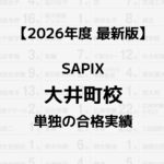2026.03.27 校舎別実績 【2026年】SAPIX大井町校単独の合格実績まとめ コージ 記事に商品PRを含む場合があります。 SAPIXの公式HPで公開している合格実績は全校舎の合計のみ。そこで本記事では、SAPIX大井町校の1校舎だけの合格実績をご紹介します。 SAPIXの校舎選びにお役立てください! コージ 中学校名をクリックすると他校舎の実績と比較できます。 男/女/共学校名合格数 共愛光中学校4 共青山学院大学系属浦和ルーテル学院中学校1 共青山学院中等部8 共青山学院横浜英和中学校4 男浅野中学校21 男麻布中学校10 女跡見学園中学校2 共市川中学校12 女浦和明の星女子中学校11 共浦和実業学園中学校1 男栄光学園中学校7 女桜蔭中学校6 女鴎友学園女子中学校5 男大阪星光学院中学校1 女大妻中学校4 女大妻中野中学校1 共大宮開成中学校12 共お茶の水女子大学附属中学校2 男海城中学校7 男開成中学校8 共開智中学校6 共開智所沢中等教育学校7 共開智日本橋学園中学校2 共開智望中等教育学校1 共かえつ有明中学校7 女学習院女子中等科2 女吉祥女子中学校3 共慶應義塾中等部4 男慶應義塾普通部3 男京華中学校1 女光塩女子学院中等科1 男攻玉社中学校15 男佼成学園中学校1 女国府台女子学院中学部6 女香蘭女学校中等科10 共國學院大學久我山中学校4 男駒場東邦中学校5 共埼玉栄中学校12 共栄東中学校110 共佐久長聖中学校34 男サレジオ学院中学校2 女実践女子学園中学校4 共品川翔英中学校5 女品川女子学院中等部5 男芝中学校5 共芝浦工業大学附属中学校2 共芝国際中学校3 共渋谷教育学園渋谷中学校5 共渋谷教育学園幕張中学校13 女淑徳与野中学校12 男城北中学校2 共昭和学院中学校2 共昭和学院秀英中学校3 女女子学院中学校7 女白百合学園中学校2 男巣鴨中学校8 共成城学園中学校1 男聖光学院中学校13 共青稜中学校22 男世田谷学園中学校5 女洗足学園中学校5 男高輪中学校8 共多摩大学目黒中学校4 共千葉日本大学第一中学校1 共中央大学附属横浜中学校2 男筑波大学附属駒場中学校4 女田園調布学園中等部4 女東京女学館中学校4 共東京都市大学等々力中学校12 男東京都市大学付属中学校10 共東京都立桜修館中等教育学校3 共東京都立白鴎高等学校附属中学校1 共東京農業大学第一高等学校中等部9 共東邦大学付属東邦中学校6 男桐朋中学校1 女豊島岡女子学園中学校12 男獨協中学校5 共獨協埼玉中学校1 共長崎日本大学中学校2 共日本大学第一中学校1 共日本大学中学校1 男日本大学豊山中学校1 女日本女子大学附属中学校1 男函館ラ・サール中学校2 共広尾学園小石川中学校5 共広尾学園中学校24 女フェリス女学院中学校9 共武南中学校1 女普連土学園中学校10 共文教大学付属中学校1 共法政大学第二中学校2 男北嶺中学校1 男本郷中学校12 共三田国際科学学園中学校8 共宮崎日本大学中学校2 男武蔵中学校2 共明治大学付属世田谷中学校2 男明治大学付属中野中学校3 共明治大学付属明治中学校3 共目黒日本大学中学校2 共盛岡白百合学園中学校3 共山手学院中学校1 女山脇学園中学校5 女横浜共立学園中学校1 男立教池袋中学校6 女立教女学院中学校2 男立教新座中学校2 共立正大学付属立正中学校1 共早稲田佐賀中学校3 共早稲田実業学校中等部3 男早稲田中学校7 女和洋国府台女子中学校1 あわせて読みたいSAPIX入室テストの全貌 出題傾向と対策法まとめ【2026年版】 あわせて読みたいSAPIXの年間費用は?全学年の試算結果リスト【2026最新版】 ABOUT ME コージ元SAPIX小学部講師Contact2013年からSAPIX小学部で国語を指導。SS麻布・桜蔭コースなど担当。2024年に退職しサピログを開設。