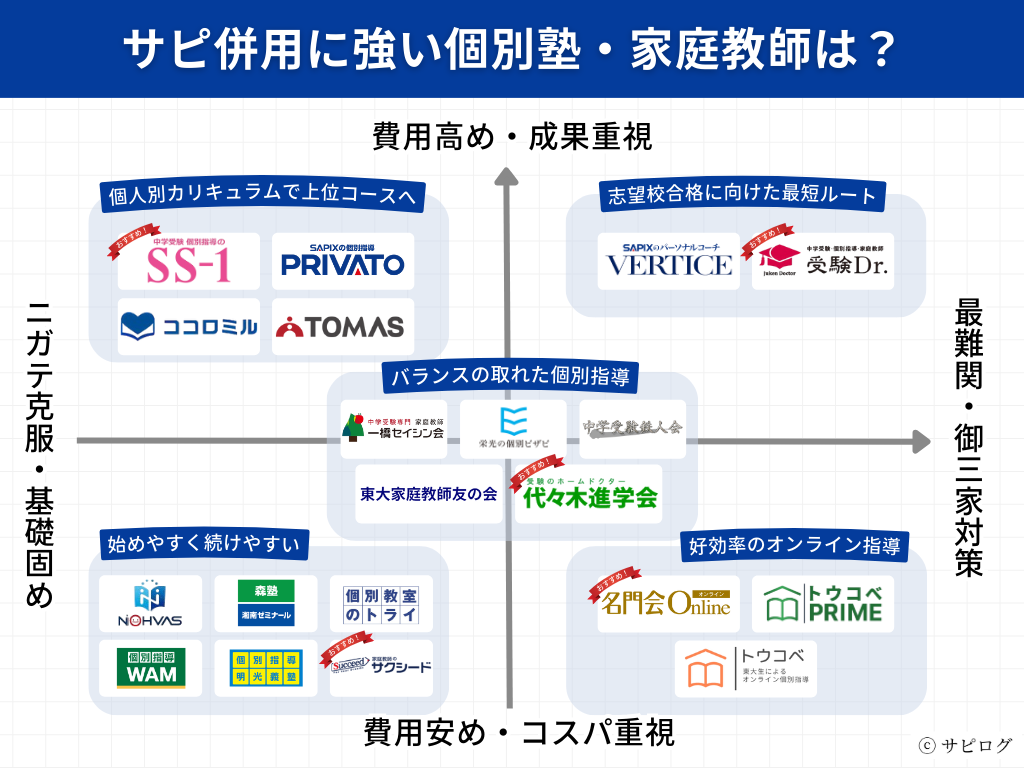 そこで、多くの家庭がサピ併用塾を選ぶときの決め手にする「費用」と「利用目的」の2軸で分類して、自信を持ってオススメする個別塾と家庭教師センター5社をピックアップしました。