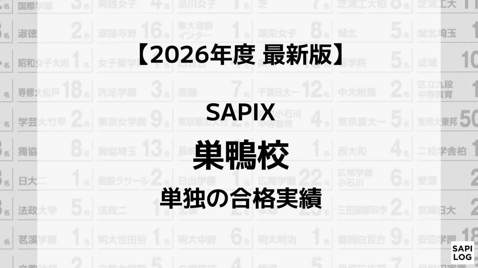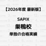 2026.03.27 2026.03.28 校舎別実績 【2026年】SAPIX巣鴨校単独の合格実績まとめ コージ 記事に商品PRを含む場合があります。 SAPIXの公式HPで公開している合格実績は全校舎の合計のみ。 そこで本記事では、SAPIX巣鴨校の1校舎だけの合格実績をご紹介します。 SAPIXの校舎選びにお役立てください! コージ 中学校名をクリックすると他校舎の実績と比較できます。 男/女/共学校名合格数 共愛光中学校1 共青山学院大学系属浦和ルーテル学院中学校1 共青山学院中等部5 男浅野中学校1 男麻布中学校7 女跡見学園中学校1 共郁文館中学校2 共市川中学校14 女浦和明の星女子中学校29 共浦和学院中学校1 共浦和実業学園中学校4 男栄光学園中学校1 共江戸川学園取手中学校1 女桜蔭中学校13 女鴎友学園女子中学校2 女大妻中学校9 女大妻嵐山中学校1 女大妻中野中学校3 共大手前高松中学校1 共大宮開成中学校22 男海城中学校19 男開成中学校15 共開智中学校9 共開智所沢中等教育学校8 共開智日本橋学園中学校5 共開智未来中学校4 男海陽中等教育学校2 女学習院女子中等科7 共北里大学附属順天中学校3 女吉祥女子中学校11 男暁星中学校4 女共立女子中学校6 共慶應義塾中等部6 男慶應義塾普通部2 男京華中学校2 女恵泉女学園中学校2 女光塩女子学院中等科2 男攻玉社中学校2 女国府台女子学院中学部2 女香蘭女学校中等科2 共國學院大學久我山中学校1 共駒込中学校1 共埼玉栄中学校9 共栄東中学校168 共佐久長聖中学校10 女実践女子学園中学校1 女品川女子学院中等部2 男芝中学校6 共芝浦工業大学柏中学校1 共芝浦工業大学附属中学校1 共芝国際中学校1 共渋谷教育学園渋谷中学校13 共渋谷教育学園幕張中学校21 女十文字中学校3 共淑徳巣鴨中学校5 共淑徳中学校4 女淑徳与野中学校28 男城北埼玉中学校1 男城北中学校11 女頌栄女子学院中学校7 女女子学院中学校7 女白百合学園中学校3 男巣鴨中学校22 男聖学院中学校1 共成城学園中学校1 男聖光学院中学校12 男成城中学校5 男世田谷学園中学校4 共専修大学松戸中学校4 女洗足学園中学校2 男高輪中学校3 共中央大学附属横浜中学校1 男筑波大学附属駒場中学校10 共筑波大学附属中学校5 共東海大学付属高輪台高等学校中等部1 女東京女学館中学校2 共東京学芸大学附属竹早中学校1 共東京電機大学中学校1 男東京都市大学付属中学校1 共東京都立小石川中等教育学校10 共東京農業大学第一高等学校中等部4 共東邦大学付属東邦中学校4 女東洋英和女学院中学部2 共東洋大学京北中学校6 女豊島岡女子学園中学校25 男獨協中学校6 共獨協埼玉中学校2 共長崎日本大学中学校7 男灘中学校4 共西大和学園中学校2 男日本大学豊山中学校2 女日本大学豊山女子中学校1 女日本女子大学附属中学校1 男函館ラ・サール中学校1 共広尾学園小石川中学校15 共広尾学園中学校8 女富士見中学校1 女雙葉中学校3 共武南中学校1 女普連土学園中学校9 共法政大学第二中学校1 共法政大学中学校2 男北嶺中学校1 共細田学園中学校1 男本郷中学校33 共三田国際科学学園中学校2 共宮崎日本大学中学校1 女三輪田学園中学校2 男武蔵中学校2 共明治大学付属世田谷中学校1 共明治大学付属八王子中学校1 共盛岡白百合学園中学校7 共安田学園中学校1 女山脇学園中学校6 男洛星中学校1 男ラ・サール中学校1 女立教女学院中学校1 男立教新座中学校9 共早稲田佐賀中学校2 共早稲田実業学校中等部1 男早稲田大学高等学院中学部3 男早稲田中学校12 女和洋国府台女子中学校3 【PR】SAPIXと上手に付き合うには?知っておきたい「使い方」 中学受験では、正しい情報収集が大切。特にSAPIX生のご家庭は、塾に通うことと同じくらい「うまく塾を使いこなす」ことが重要です。 個別指導のSS-1では「合格を決める塾の使い方」という資料を用意しています。毎年約250人のSAPIX生を指導する個別指導塾が見てきた、SAPIX生の成績が伸び悩む理由・学習の要点をまとめた、SAPIXの攻略本というべき一冊です。 大手塾と併用して「最短で塾の成績を伸ばす」ことがSS-1のモットー。講師は全員社会人、SAPIXのテキストやカリキュラムを前提とした指導が受けられる、幅広いSAPIX生にオススメの個別塾です。資料ダウンロード・体験授業(どちらも無料)は、公式HPからお申し込みください! サピログ独占インタビューなぜSS-1はSAPIX生に人気?教室長に直撃して分かった“伸びる家庭”の共通点 あわせて読みたいSAPIX入室テストの全貌 出題傾向と対策法まとめ【2026年版】 あわせて読みたいSAPIXの年間費用は?全学年の試算結果リスト【2026最新版】 ABOUT ME コージ元SAPIX小学部講師Contact2013年からSAPIX小学部で国語を指導。SS麻布・桜蔭コースなど担当。2024年に退職しサピログを開設。