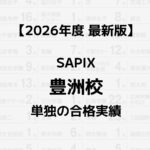 2026.03.27 校舎別実績 【2026年】SAPIX豊洲校単独の合格実績まとめ コージ 記事に商品PRを含む場合があります。 SAPIXの公式HPで公開している合格実績は全校舎の合計のみ。そこで本記事では、SAPIX豊洲校の1校舎だけの合格実績をご紹介します。 SAPIXの校舎選びにお役立てください! コージ 中学校名をクリックすると他校舎の実績と比較できます。 男/女/共学校名合格数 共青山学院中等部4 共青山学院横浜英和中学校1 男浅野中学校1 男麻布中学校5 女跡見学園中学校4 共市川中学校30 女浦和明の星女子中学校6 女桜蔭中学校4 女大妻中学校8 共大宮開成中学校10 共お茶の水女子大学附属中学校1 男海城中学校10 男開成中学校7 共開智中学校2 共開智日本橋学園中学校5 共開智未来中学校1 共かえつ有明中学校7 男学習院中等科2 女学習院女子中等科5 共北里大学附属順天中学校2 女吉祥女子中学校3 男暁星中学校1 女共立女子中学校3 共慶應義塾中等部3 男慶應義塾普通部1 男京華中学校2 女光塩女子学院中等科1 男攻玉社中学校4 男佼成学園中学校1 女国府台女子学院中学部8 共神戸大学附属中等教育学校1 女香蘭女学校中等科6 男駒場東邦中学校1 共埼玉栄中学校9 共栄東中学校63 共佐久長聖中学校12 共サレジアン国際学園中学校1 男静岡聖光学院中学校1 女実践女子学園中学校2 女品川女子学院中等部5 男芝中学校9 共芝浦工業大学附属中学校8 共芝国際中学校4 共渋谷教育学園渋谷中学校8 共渋谷教育学園幕張中学校20 女淑徳与野中学校9 男城北埼玉中学校1 男城北中学校2 共昭和学院中学校1 女頌栄女子学院中学校4 共昭和学院秀英中学校31 女昭和女子大学附属昭和中学校1 女女子学院中学校4 女白百合学園中学校2 男巣鴨中学校2 共青雲中学校1 男聖光学院中学校4 男成城中学校2 共青稜中学校7 男世田谷学園中学校5 共専修大学松戸中学校7 女洗足学園中学校1 共高槻中学校1 男高輪中学校2 共千葉日本大学第一中学校3 共千代田区立九段中等教育学校3 男筑波大学附属駒場中学校2 共筑波大学附属中学校1 共東海大学付属浦安高等学校中等部13 共東海大学付属高輪台高等学校中等部1 女東京女学館中学校5 男東京都市大学付属中学校3 共東京都立小石川中等教育学校2 共東京都立桜修館中等教育学校1 共東京農業大学第一高等学校中等部5 共東邦大学付属東邦中学校6 女東洋英和女学院中学部2 女豊島岡女子学園中学校6 男獨協中学校4 共獨協埼玉中学校1 共長崎日本大学中学校4 男名古屋中学校1 男灘中学校1 共西大和学園中学校2 共日本大学第一中学校3 男日本大学豊山中学校2 女日本大学豊山女子中学校1 女日本女子大学附属中学校1 男函館ラ・サール中学校1 共羽田国際中学校1 共広尾学園小石川中学校6 共広尾学園中学校17 女富士見中学校1 女雙葉中学校2 共武南中学校1 女普連土学園中学校4 共法政大学第二中学校1 男北嶺中学校3 共細田学園中学校1 男本郷中学校14 共三田国際科学学園中学校4 女三輪田学園中学校1 共明治大学付属世田谷中学校3 男明治大学付属中野中学校3 共目黒日本大学中学校1 共盛岡白百合学園中学校2 共安田学園中学校5 女山脇学園中学校7 男立教池袋中学校2 女立教女学院中学校1 男立教新座中学校5 共麗澤中学校1 共早稲田佐賀中学校3 共早稲田実業学校中等部1 男早稲田大学高等学院中学部1 男早稲田中学校6 【PR】SAPIXと上手に付き合うには?知っておきたい「使い方」 中学受験では、正しい情報収集が大切。特にSAPIX生のご家庭は、塾に通うことと同じくらい「うまく塾を使いこなす」ことが重要です。 個別指導のSS-1では「合格を決める塾の使い方」という資料を用意しています。毎年約250人のSAPIX生を指導する個別指導塾が見てきた、SAPIX生の成績が伸び悩む理由・学習の要点をまとめた、SAPIXの攻略本というべき一冊です。 大手塾と併用して「最短で塾の成績を伸ばす」ことがSS-1のモットー。講師は全員社会人、SAPIXのテキストやカリキュラムを前提とした指導が受けられる、幅広いSAPIX生にオススメの個別塾です。資料ダウンロード・体験授業(どちらも無料)は、公式HPからお申し込みください! サピログ独占インタビューなぜSS-1はSAPIX生に人気?教室長に直撃して分かった“伸びる家庭”の共通点 あわせて読みたいSAPIX入室テストの全貌 出題傾向と対策法まとめ【2026年版】 あわせて読みたいSAPIXの年間費用は?全学年の試算結果リスト【2026最新版】 ABOUT ME コージ元SAPIX小学部講師Contact2014年からSAPIX小学部で国語を指導/SS麻布・桜蔭コースなど担当/月間最高11万PVの中学受験ブログ「サピログ」を運営