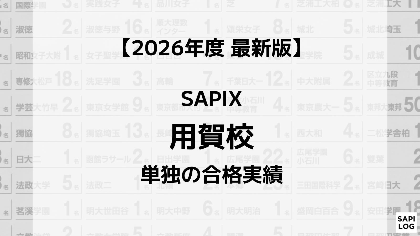 2026.03.27 校舎別実績 【2026年】SAPIX用賀校単独の合格実績まとめ コージ 記事に商品PRを含む場合があります。 SAPIXの公式HPで公開している合格実績は全校舎の合計のみ。そこで本記事では、SAPIX用賀校の1校舎だけの合格実績をご紹介します。 SAPIXの校舎選びにお役立てください! コージ 中学校名をクリックすると他校舎の実績と比較できます。 男/女/共学校名合格数 共青山学院中等部2 男浅野中学校3 男麻布中学校7 共郁文館中学校1 共市川中学校1 女浦和明の星女子中学校6 男栄光学園中学校1 女桜蔭中学校4 女鴎友学園女子中学校10 女大妻中学校4 共大宮開成中学校4 男海城中学校6 男開成中学校3 共開智中学校3 共開智所沢中等教育学校7 共開智望中等教育学校1 男学習院中等科1 女学習院女子中等科1 共神奈川大学附属中学校1 女カリタス女子中学校3 共北里大学附属順天中学校1 女吉祥女子中学校1 男暁星中学校3 女共立女子中学校3 共慶應義塾湘南藤沢中等部4 共慶應義塾中等部5 男慶應義塾普通部5 女恵泉女学園中学校7 男攻玉社中学校6 男佼成学園中学校2 女国府台女子学院中学部1 女香蘭女学校中等科1 共國學院大學久我山中学校2 男駒場東邦中学校15 共栄東中学校35 共佐久長聖中学校78 共サレジアン国際学園世田谷中学校4 男サレジオ学院中学校3 男静岡聖光学院中学校1 女実践女子学園中学校3 共品川翔英中学校2 男芝中学校7 共芝国際中学校1 共渋谷教育学園渋谷中学校15 共渋谷教育学園幕張中学校5 女淑徳与野中学校7 男城北埼玉中学校2 男城北中学校1 女頌栄女子学院中学校1 共昭和学院秀英中学校1 女昭和女子大学附属昭和中学校3 女女子学院中学校4 女白百合学園中学校4 男巣鴨中学校4 共成蹊中学校1 共成城学園中学校1 男聖光学院中学校6 共青稜中学校6 共星稜中学校1 男世田谷学園中学校29 女洗足学園中学校5 男高輪中学校2 共多摩大学目黒中学校3 共中央大学附属横浜中学校3 共千代田中学校1 男筑波大学附属駒場中学校1 共筑波大学附属中学校2 女田園調布学園中等部6 女東京女学館中学校11 共東京学芸大学附属世田谷中学校1 共東京都市大学等々力中学校24 男東京都市大学付属中学校16 共東京都立桜修館中等教育学校2 共東京農業大学第一高等学校中等部31 共同志社中学校1 男桐朋中学校4 女東洋英和女学院中学部4 女豊島岡女子学園中学校2 男獨協中学校2 共長崎日本大学中学校5 共日本大学中学校1 男日本大学豊山中学校3 共日本工業大学駒場中学校5 男函館ラ・サール中学校1 共広尾学園中学校5 女不二聖心女子学院中学校1 女普連土学園中学校4 共法政大学第二中学校1 男北嶺中学校1 男本郷中学校8 共三田国際科学学園中学校7 共宮崎日本大学中学校7 共明治学院中学校1 男明治大学付属中野中学校1 共明治大学付属明治中学校1 共盛岡白百合学園中学校10 共八雲学園中学校1 女山脇学園中学校5 女横浜雙葉中学校1 男ラ・サール中学校1 男立教池袋中学校1 男立教新座中学校9 共早稲田佐賀中学校15 男早稲田大学高等学院中学部1 男早稲田中学校4 【PR】SAPIXと上手に付き合うには?知っておきたい「使い方」 中学受験では、正しい情報収集が大切。特にSAPIX生のご家庭は、塾に通うことと同じくらい「うまく塾を使いこなす」ことが重要です。 個別指導のSS-1では「合格を決める塾の使い方」という資料を用意しています。毎年約250人のSAPIX生を指導する個別指導塾が見てきた、SAPIX生の成績が伸び悩む理由・学習の要点をまとめた、SAPIXの攻略本というべき一冊です。 大手塾と併用して「最短で塾の成績を伸ばす」ことがSS-1のモットー。講師は全員社会人、SAPIXのテキストやカリキュラムを前提とした指導が受けられる、幅広いSAPIX生にオススメの個別塾です。資料ダウンロード・体験授業(どちらも無料)は、公式HPからお申し込みください! サピログ独占インタビューなぜSS-1はSAPIX生に人気?教室長に直撃して分かった“伸びる家庭”の共通点 あわせて読みたいSAPIX入室テストの全貌 出題傾向と対策法まとめ【2026年版】 あわせて読みたいSAPIXの年間費用は?全学年の試算結果リスト【2026最新版】 ABOUT ME コージ元SAPIX小学部講師Contact2013年からSAPIX小学部で国語を指導。SS麻布・桜蔭コースなど担当。2024年に退職しサピログを開設。